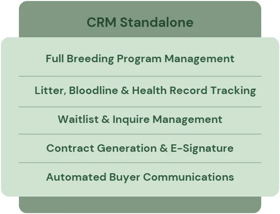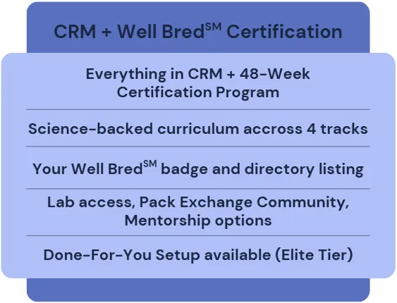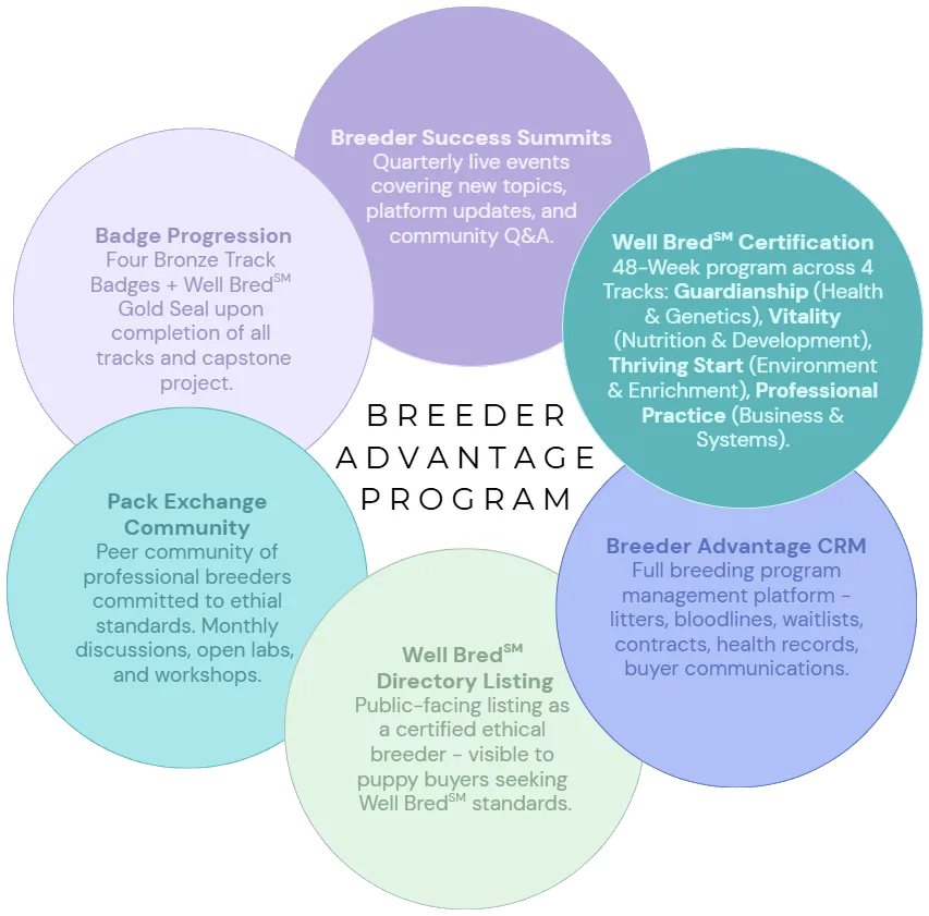 Breeder Advantage is the only program that combines a CRM built for breeding programs, the Well Bred℠ science-backed certification, and a peer community of professional breeders — into one integrated system that runs your program and builds your reputation simultaneously.